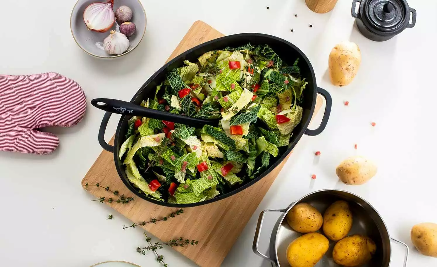 Ob Sonntagsbraten oder Weihnachtsgans – mit diesem Bräter sind Sie gut gerüstet. Der Glasdeckel mit Aromaknopf bietet die Möglichkeit, Garflüssigkeiten wie Wein oder Brühe anzugießen, ohne Energie durch das Öffnen des Deckels zu verlieren.