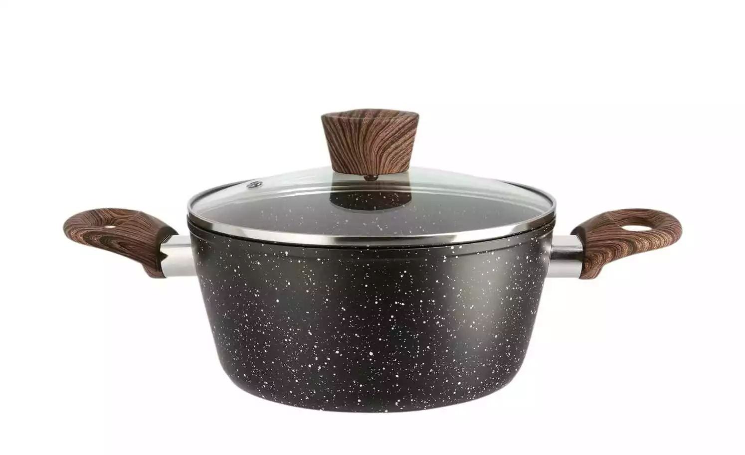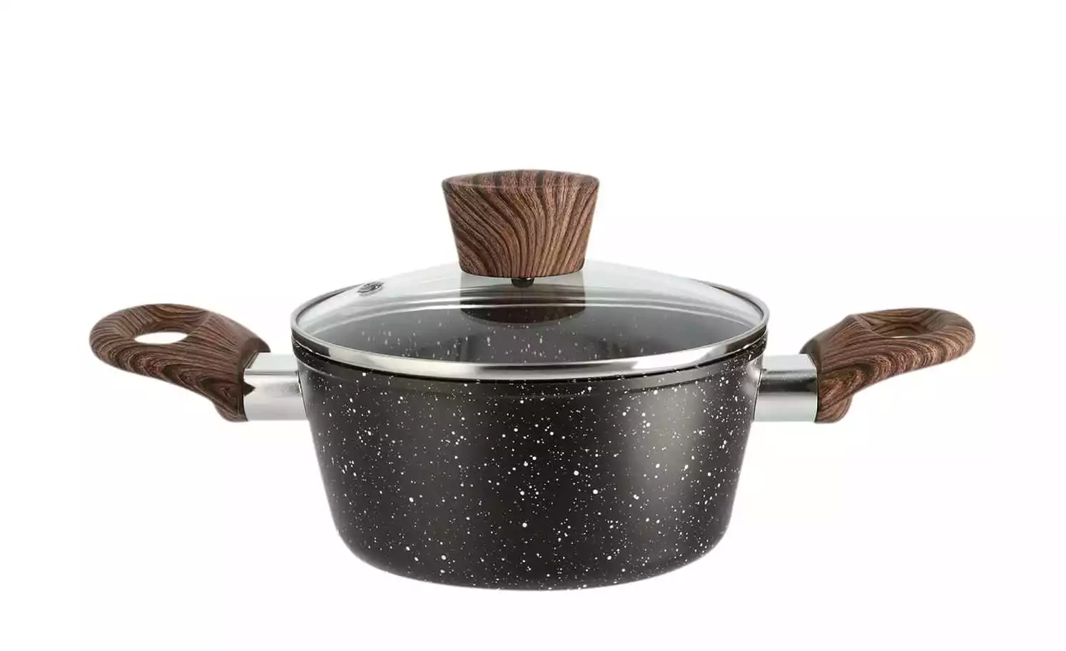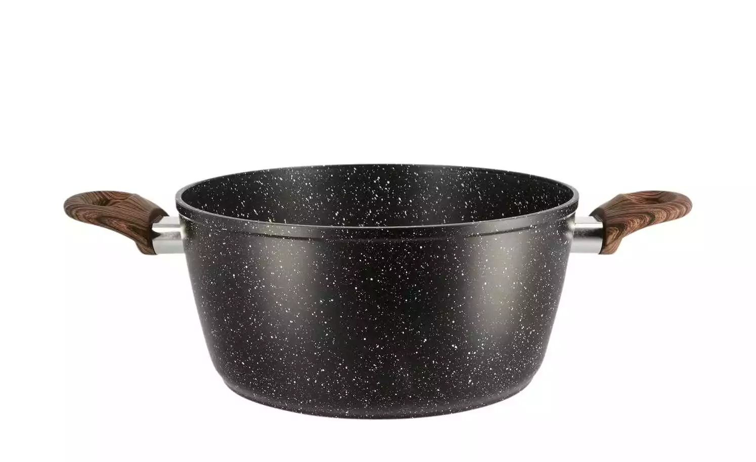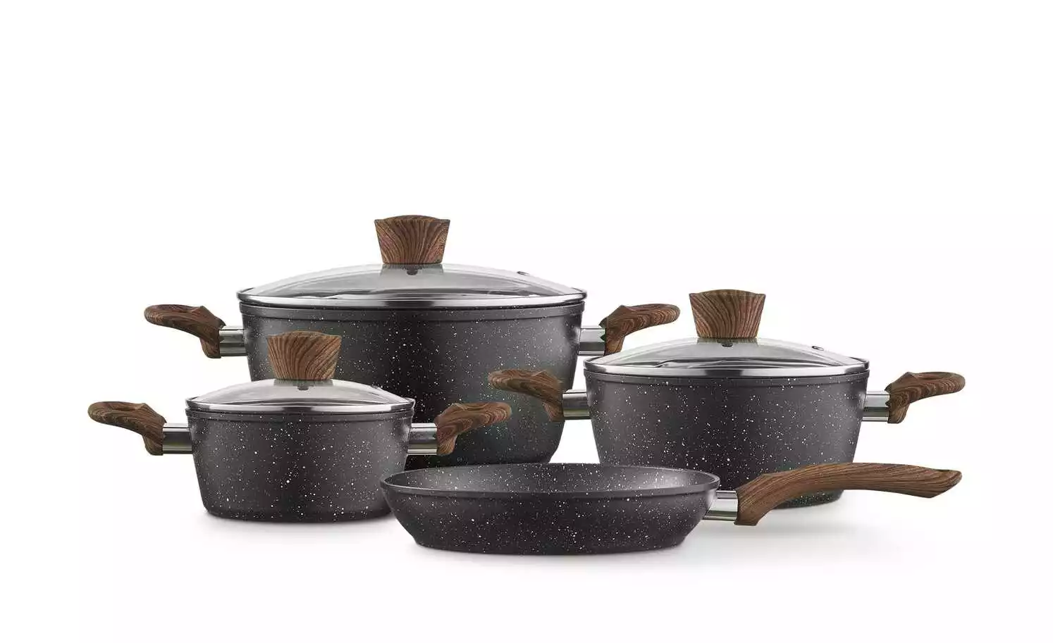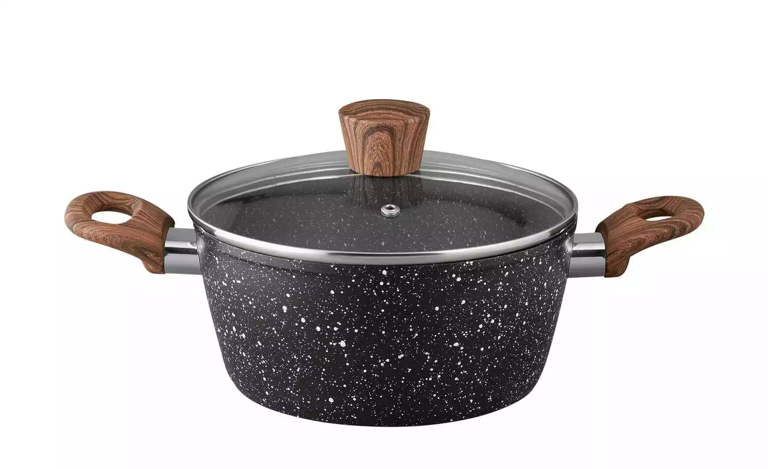 Dieses edle Topfset ist der Star in jeder Küche. Die Griffe in Holzoptik und die Marmorbeschichtung sind ein Blickfang. Das geschmiedete Aluminium ist besonders fest und haltbar, durch die Antihaftbeschichtung wird ein Anbraten verhindert. Die gute Wärmeleiteigenschaften sorgen für schnelles Erhitzen und langes Speichern der Wärme.