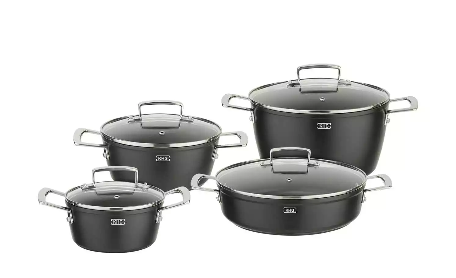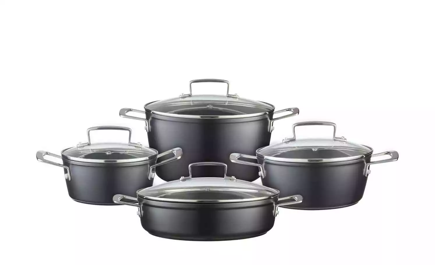 Das Topfset NERO besteht aus drei Bratentöpfen mit 16 cm, 20 cm und 24 cm Durchmesser, sowie einer Servierpfanne in 28 cm Durchmesser. Die Töpfe aus geschmiedetem Aluminium sehen mit Ihren Edelstahlgriffen sehr edel aus.