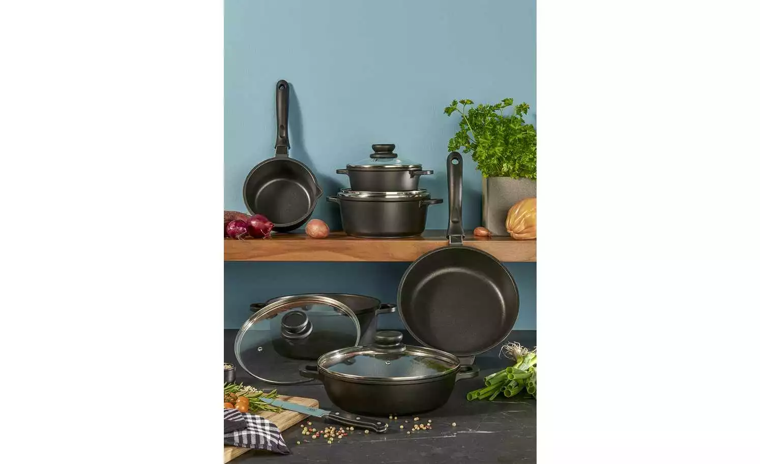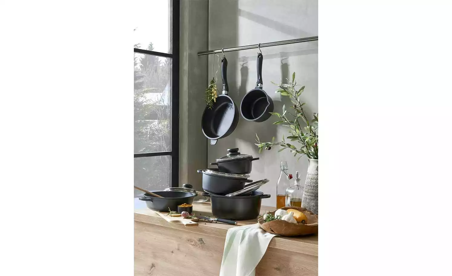 - Lieferumfang / mitgeliefertes Zubehör: 1x Stielkasserolle Ø 16 cm, 1x Servierpfanne Ø 24 cm mit Deckel, 1x Kochtopf Ø 16 cm mit Deckel, 1x Kochtopf Ø 24 cm mit Deckel, 1x Kochtopf Ø 20 cm mit Deckel, 1x Schmorpfanne Ø 24 cm